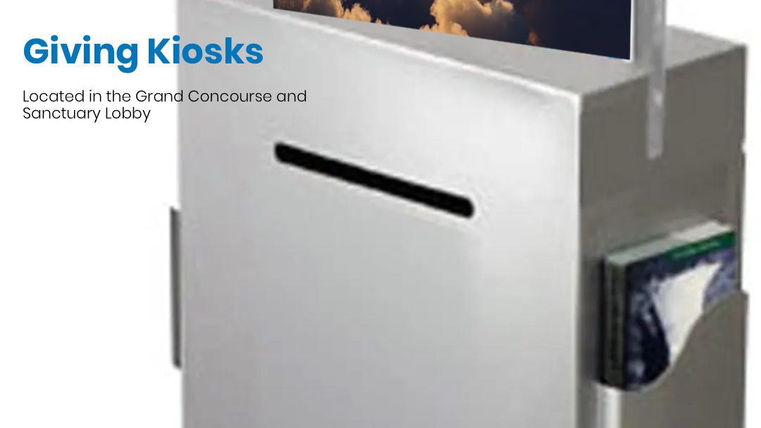 You can also give in-person when you join us for worship. Simply place your check or cash gift into one of our Kiosks. You can use a giving envelope for future records.